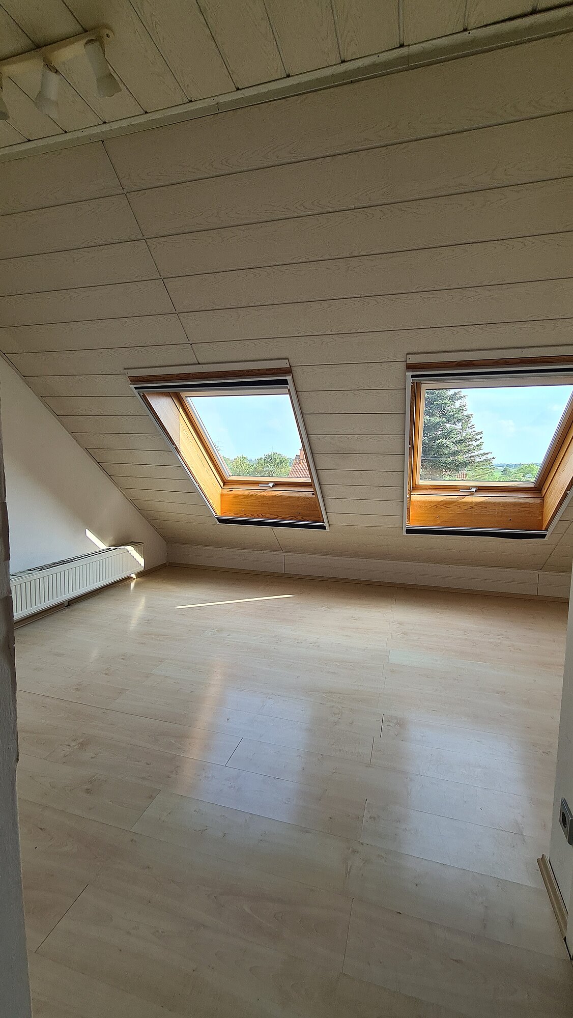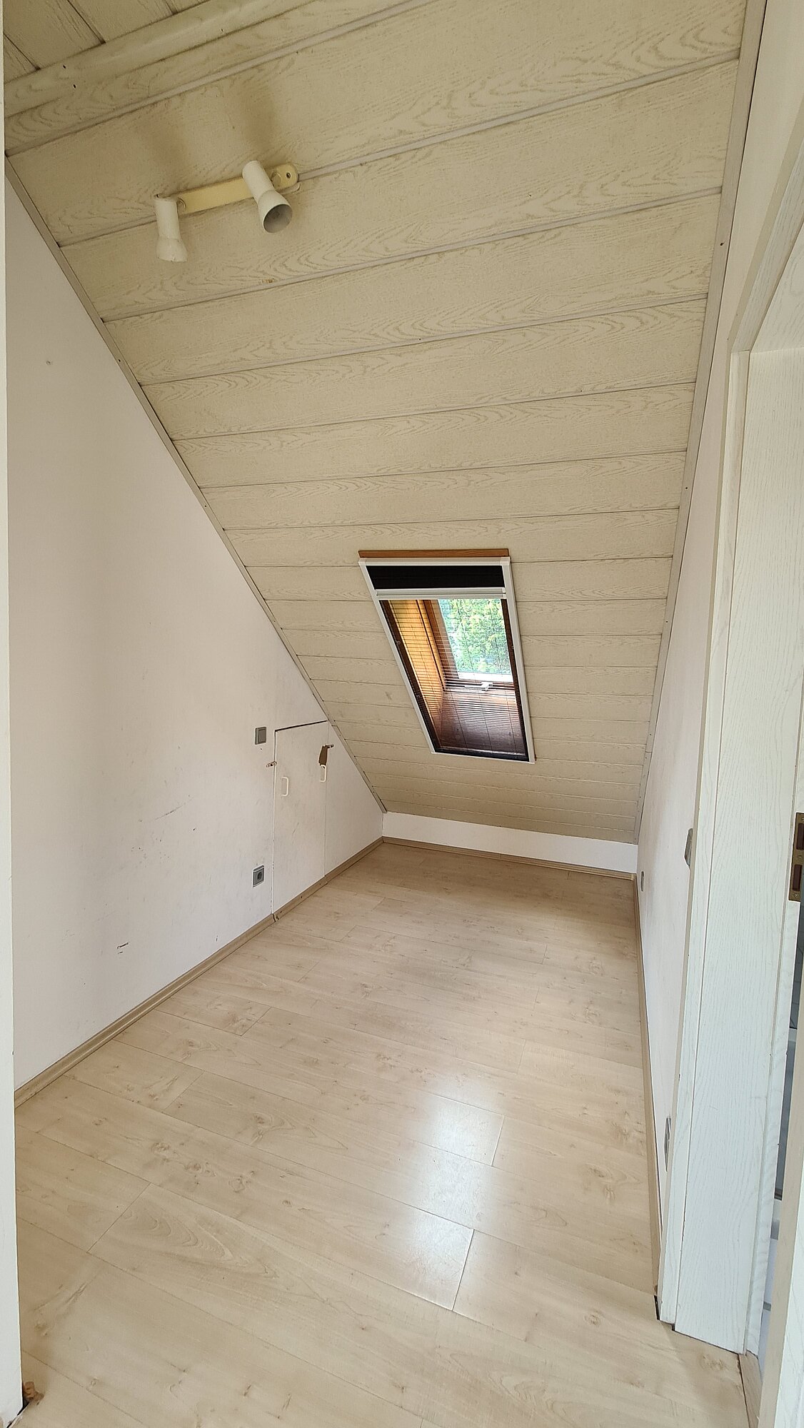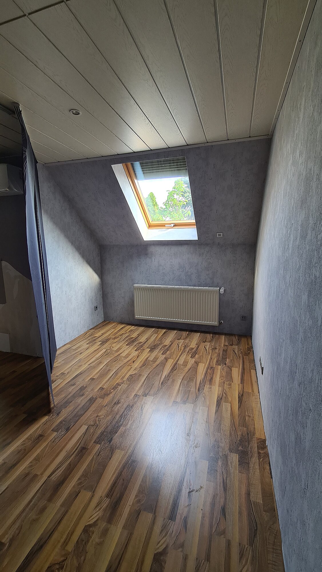 Das Obergeschoss bietet zwei Zimmer sowie ein Tageslicht-Badezimmer mit Dusche, Badewanne, WC und 2 Waschbecken. Ein weiteres Kinderzimmer wäre mittels Trennwand im Schlafzimmer möglich. Das Schlafzimmer verfügt über einen Balkon und einer 2020 installierten Klimaanlage und ein Dachflächenfenster mit Außenrollladen. Im Kinderzimmer befindet sich ein Dachflächenfenster mit Verdunkelungsrollo sowie Zugang zu dem 2. Balkon. Schlaf- und Kinderzimmer sind mit Laminat ausgelegt. Über die Treppe gelangen Sie in die oberen Räumlichkeiten. Das Dachgeschoss besteht aus 1 ½ Zimmern, einem Bad und Küchenanschlüsse sind ebenso vorhanden. Dieses kann gut als eigener Bereich für ältere Kinder oder ein Elternteil genutzt werden. Die Böden sind hier mit Laminat ausgelegt. Die zwei großen und ein kleines Dachflächenfenster durchfluten den Raum mit viel Licht und haben Fliegengitter, Jalousien und Außenrollos. Das Bad ist mit Dusche, WC und Waschbecken ausgestattet. Ein Fenster sorgt für Helligkeit und Frischluft.